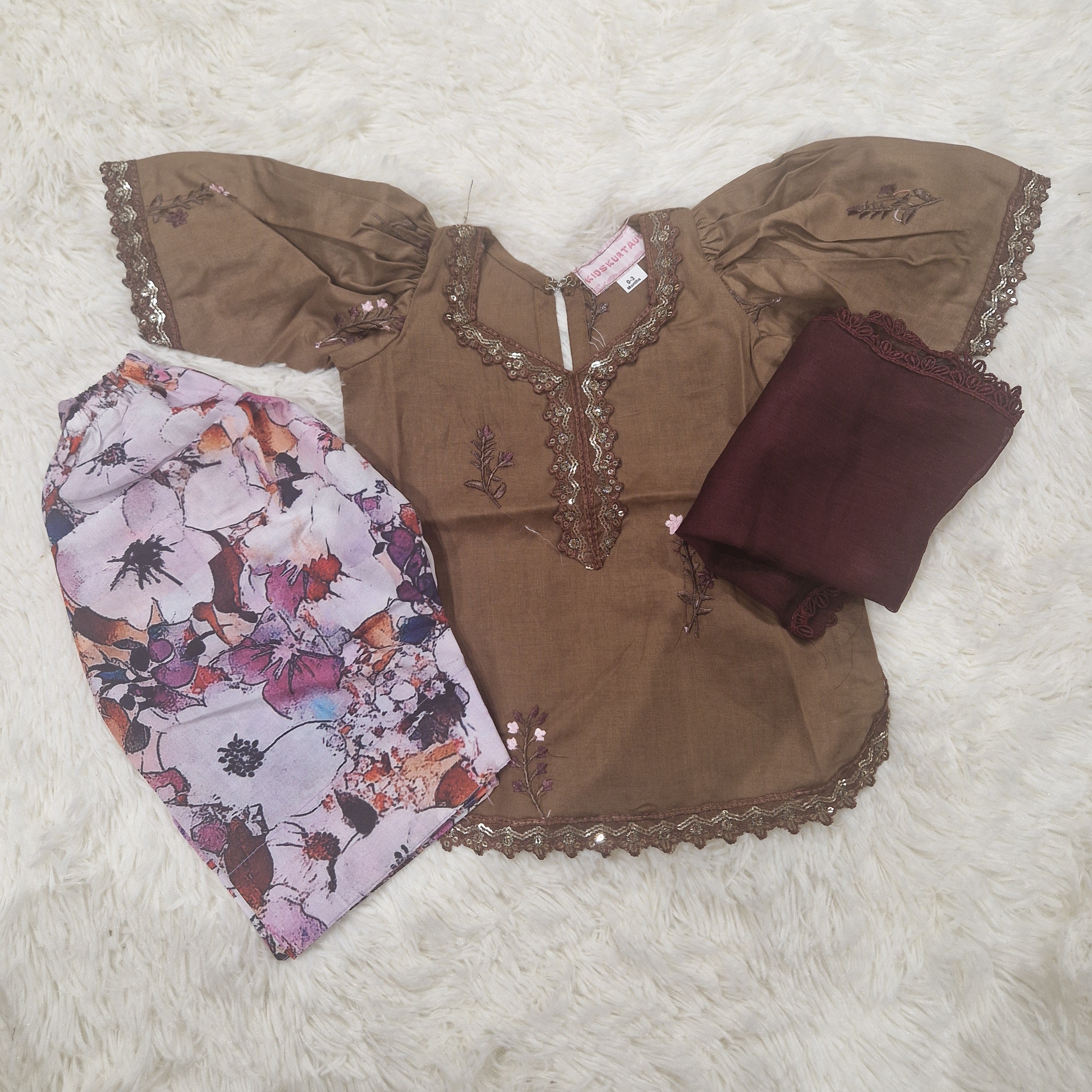 Brown puffed sleeved with farshi shalwar (0-3 months to 2-3 years)
