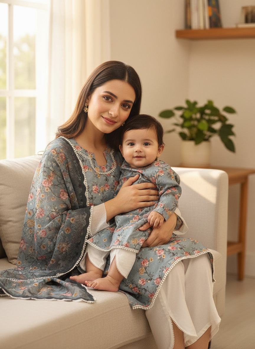 Baby is normal kurta trousers and dupatta in matching Korean lawn