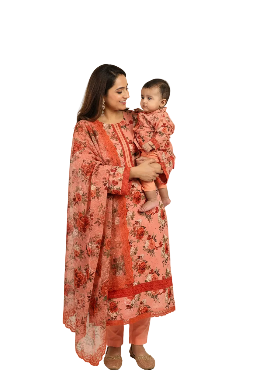 Baby is normal kurta trousers and dupatta in matching Korean lawn