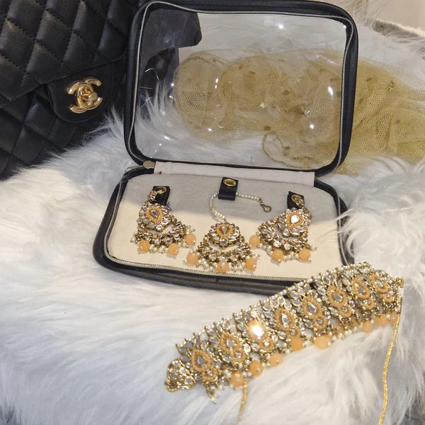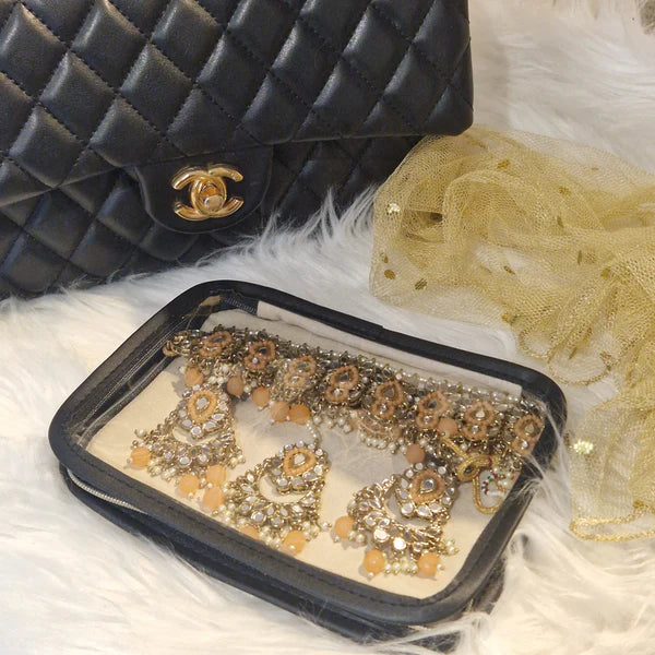 The pouch features a convenient PVC window that allows you to easily see and access your earrings, tikka or necklaces. With its Horizontal design, it offers plenty of room to store multiple items in an organised manner.
